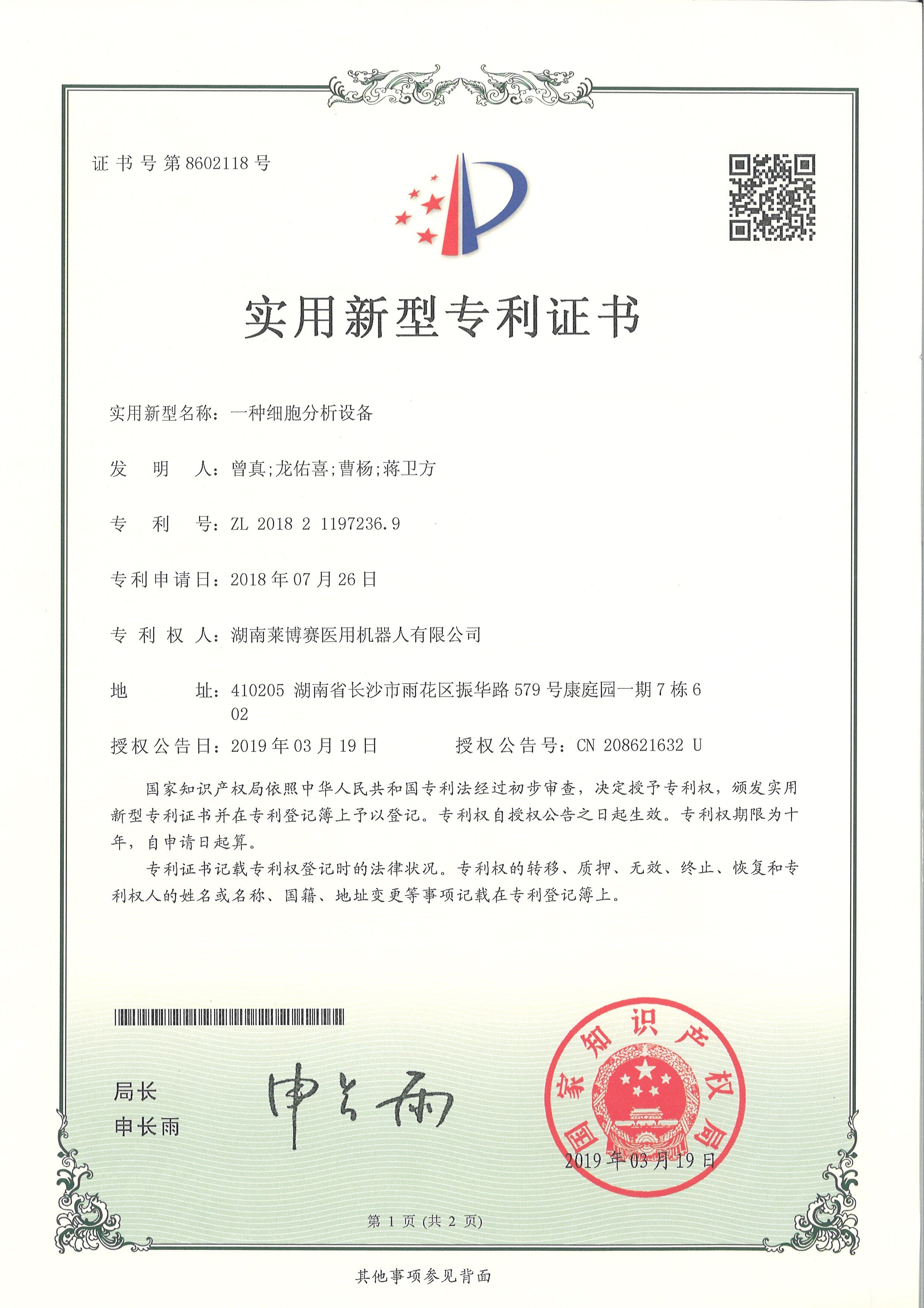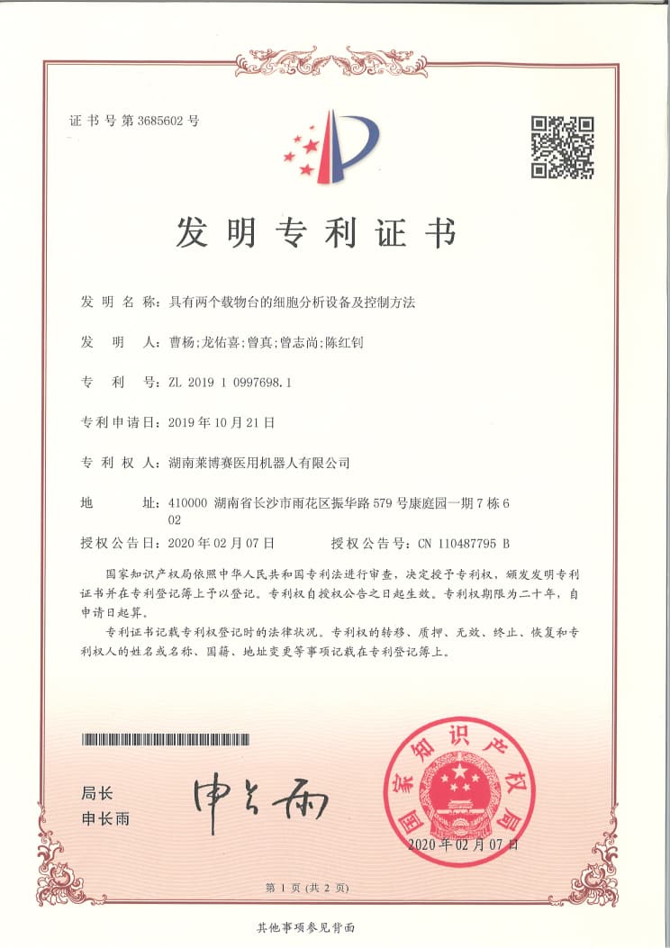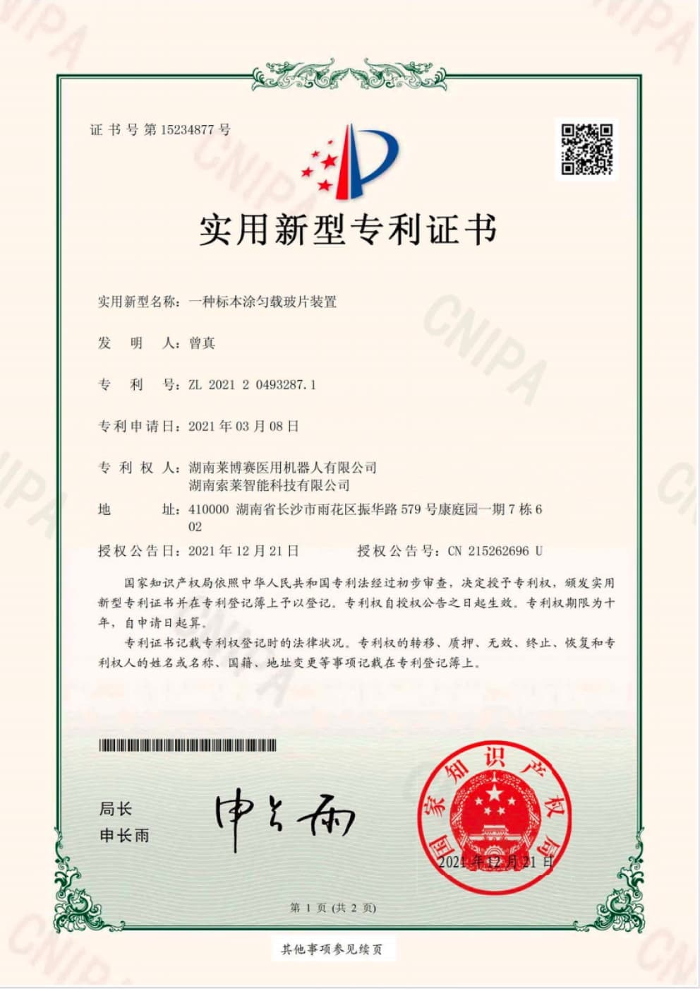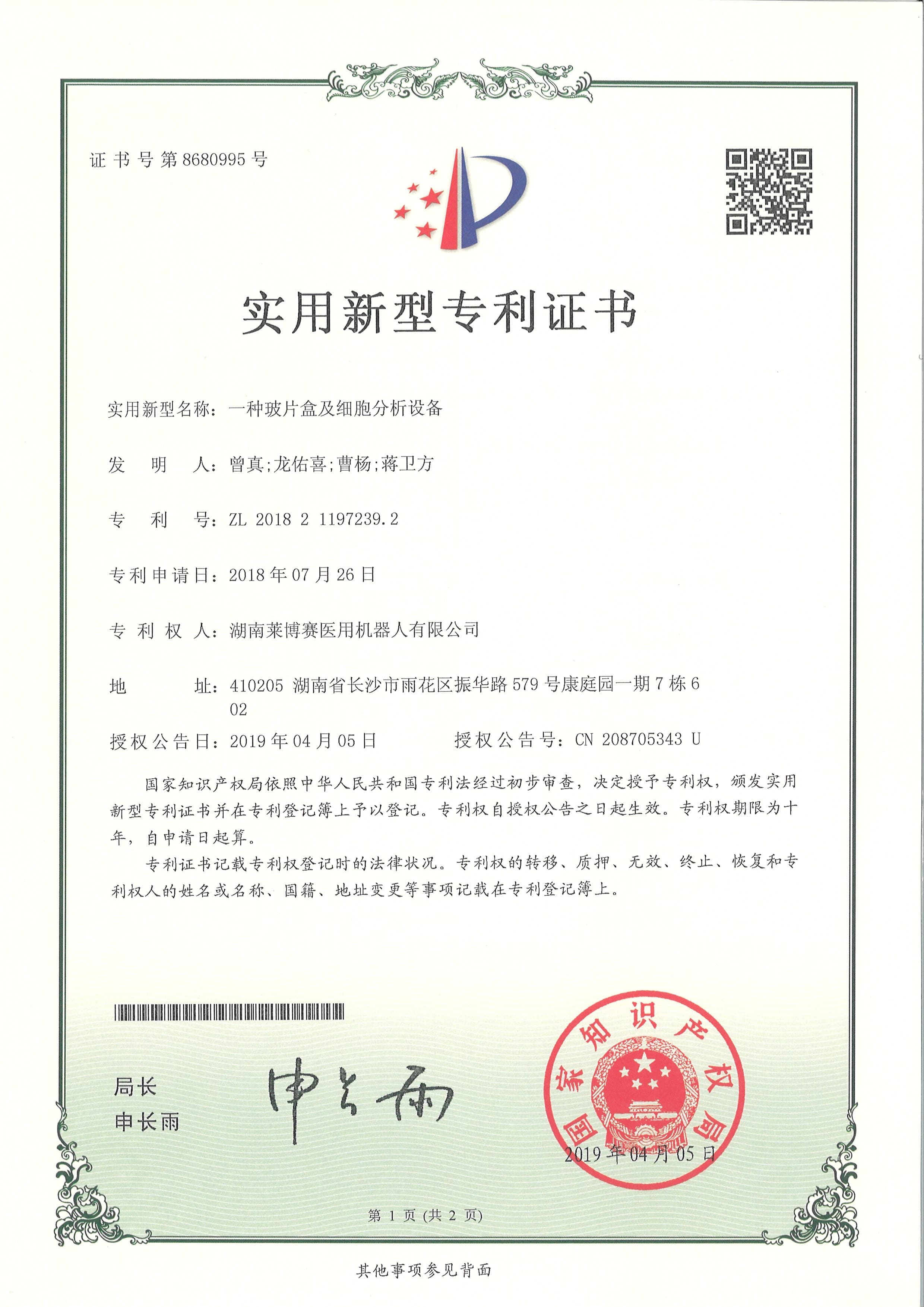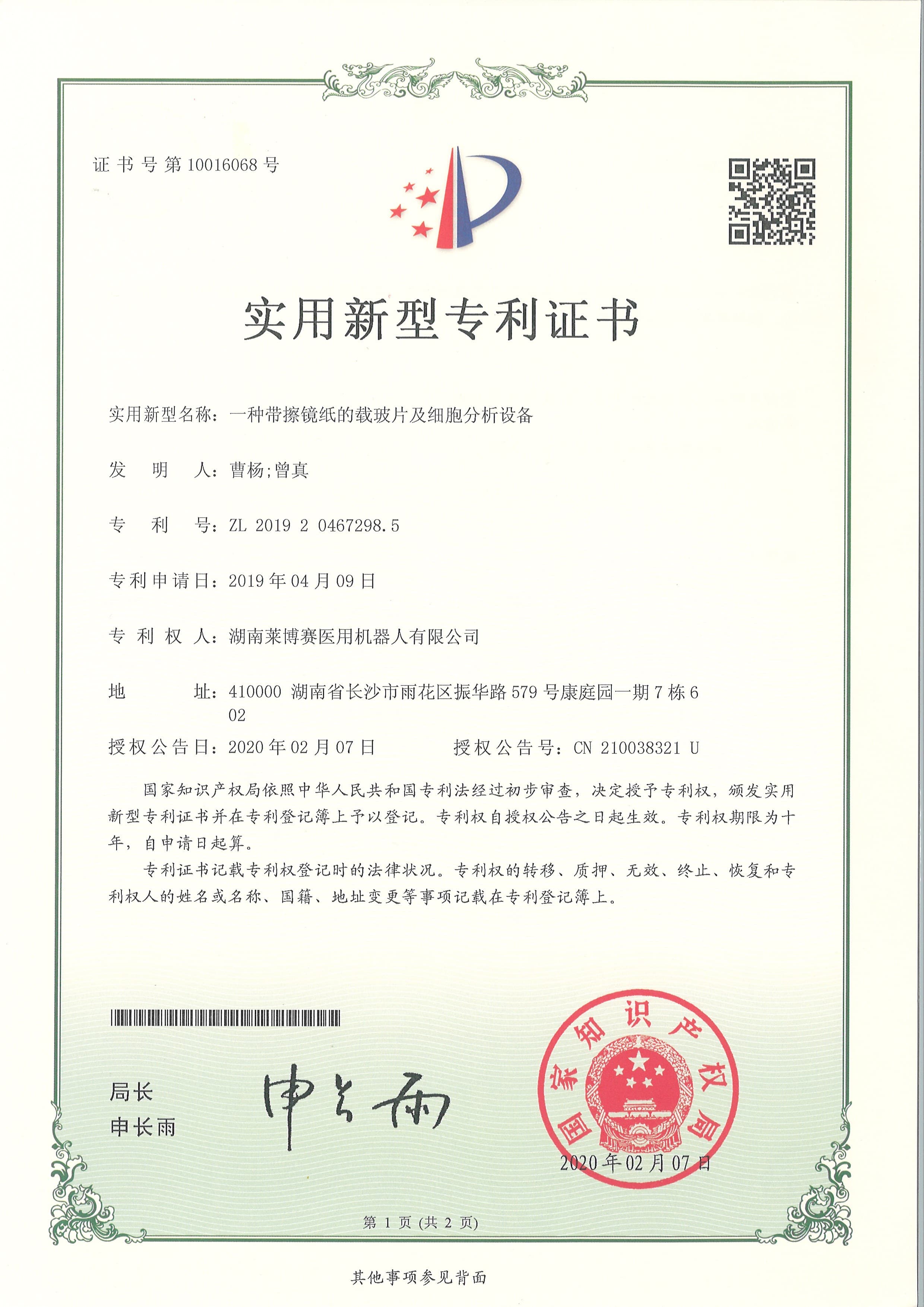 一种带擦镜纸的载玻片及细胞分析设备-发明专利证书 -